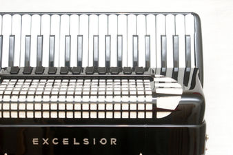 Acordeon Excelsior, made in Italy, mod. 940, 120 baixos, 4ª de voz (LMMH), duplo cassotto, com 11 registros no teclado (+ desmanche lateral) e 6 nos baixos. Vozes com rebites duplos. Em excelente estado de conservação. R$ 38.000,00.
